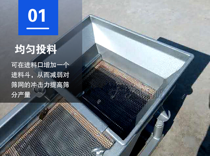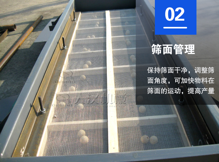 在保持篩面干凈的同時,篩面角度的調整也是增加產量的重要方法,篩面傾角為45°如果篩分的物料精度不高,只需要粗篩一下的話,可以適當調節下底座與篩體下面的部分振動彈簧高度,使進料口高度升高就可以加快物料在篩面的運動從而提高產量。