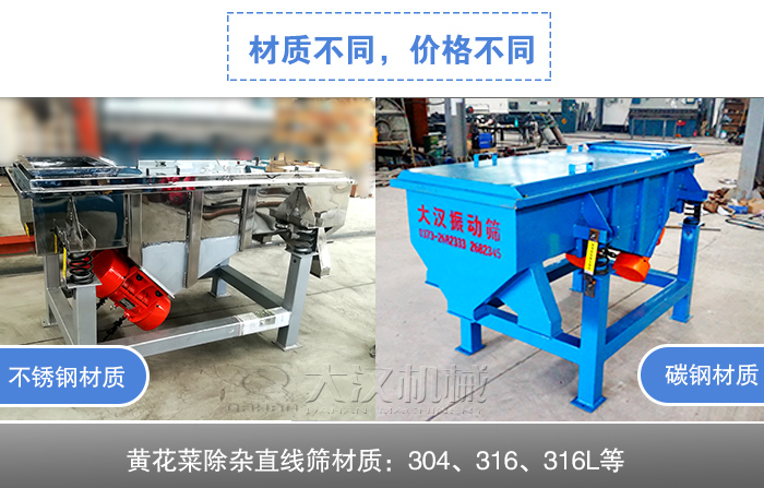 不銹鋼黃花菜除雜直線篩分為兩種結(jié)構(gòu),一種是整機均采用不銹鋼制成,另一種是與物料接觸不分為不銹鋼材質(zhì),底座為碳鋼材質(zhì),至于如何選擇就看您對衛(wèi)生環(huán)境的要求以及成本預(yù)算了。至于三種材質(zhì)的價格關(guān)系是316L>316>304,其中316L不銹鋼的價格貴,304不銹鋼是性價比高的材質(zhì)。