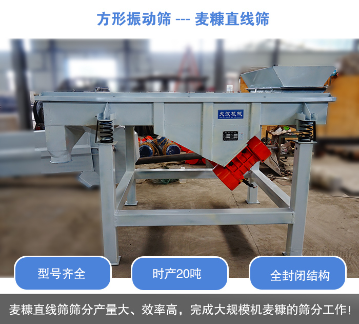 麥糠篩分使用的直線篩是一種外觀為長方形的振動篩,型號有:DZSF-515、DZSF-520、DZSF-1020、DZSF-1025、DZSF-1030、DZSF-1035、DZSF-1540等長、寬、高不同的機型。