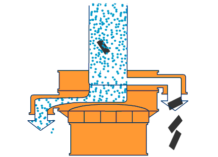 由直立式振動(dòng)電機(jī)作為激振源,電機(jī)上、下兩端安裝有偏心重錘,將電機(jī)的旋轉(zhuǎn)運(yùn)動(dòng)轉(zhuǎn)變?yōu)樗健⒋怪薄A斜的三次元運(yùn)動(dòng),再把這個(gè)運(yùn)動(dòng)傳遞給篩面進(jìn)行篩分。調(diào)節(jié)上、下兩端的相位角,可以改變物料在篩面上的運(yùn)動(dòng)軌跡。